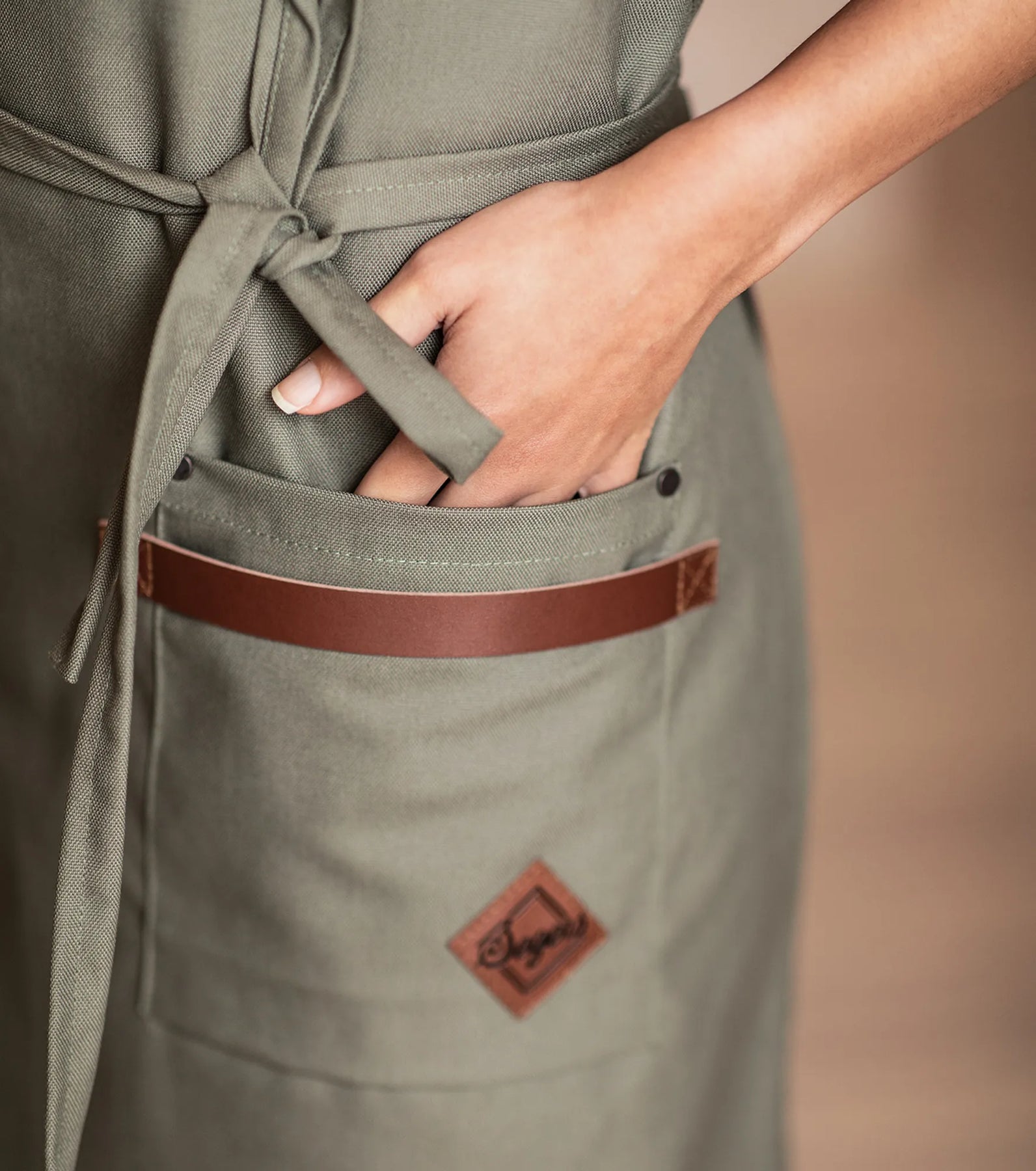 • Detaljer i konstläder vid fickan för kockslängen
