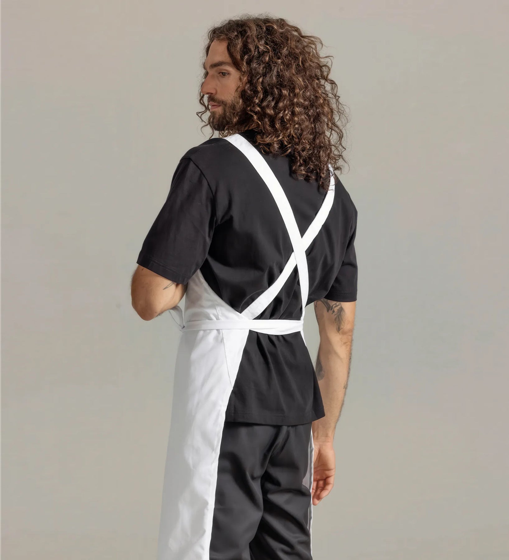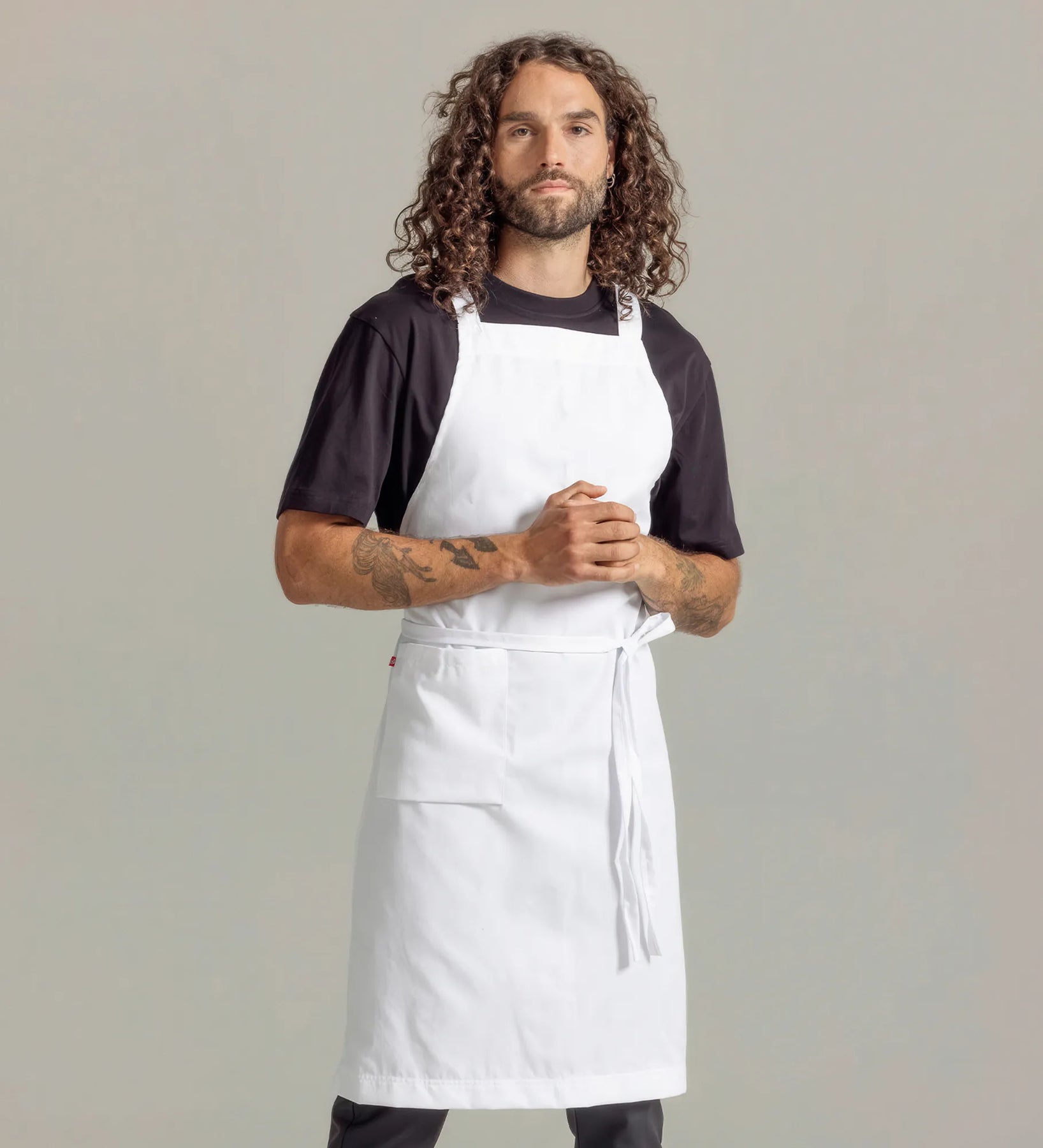 Bröstlappsförkläde med ergonomi i fokus tack vare kors i ryggen med reglerbara hängslen.