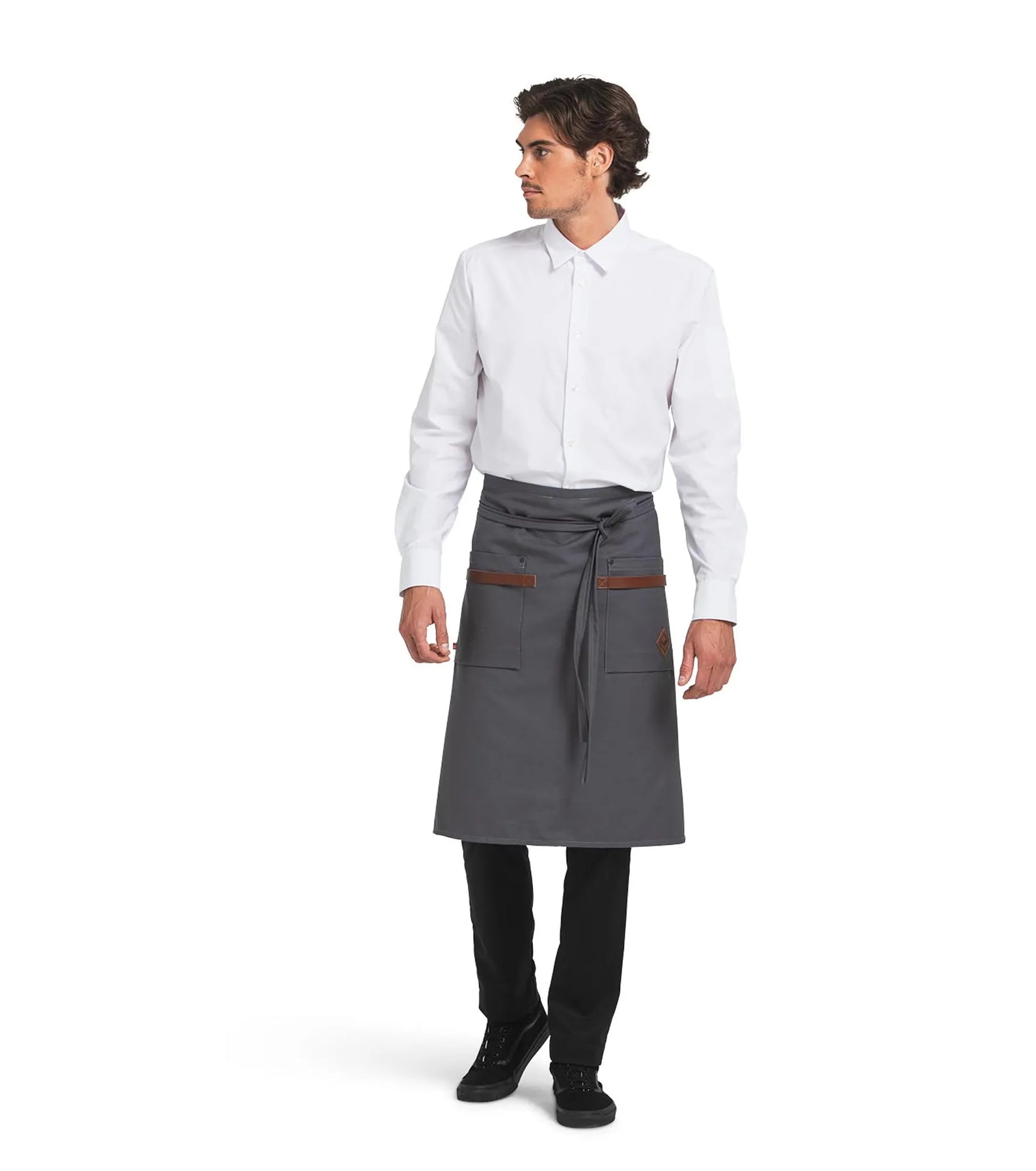 Sloof van zware canvas stof. Stijlvolle afwasbare details in kunstleer bij de twee ruime zakken. Zowel stijlvolle als praktische sloof voor keuken / catering / bar of andere ambachtelijke beroepen.