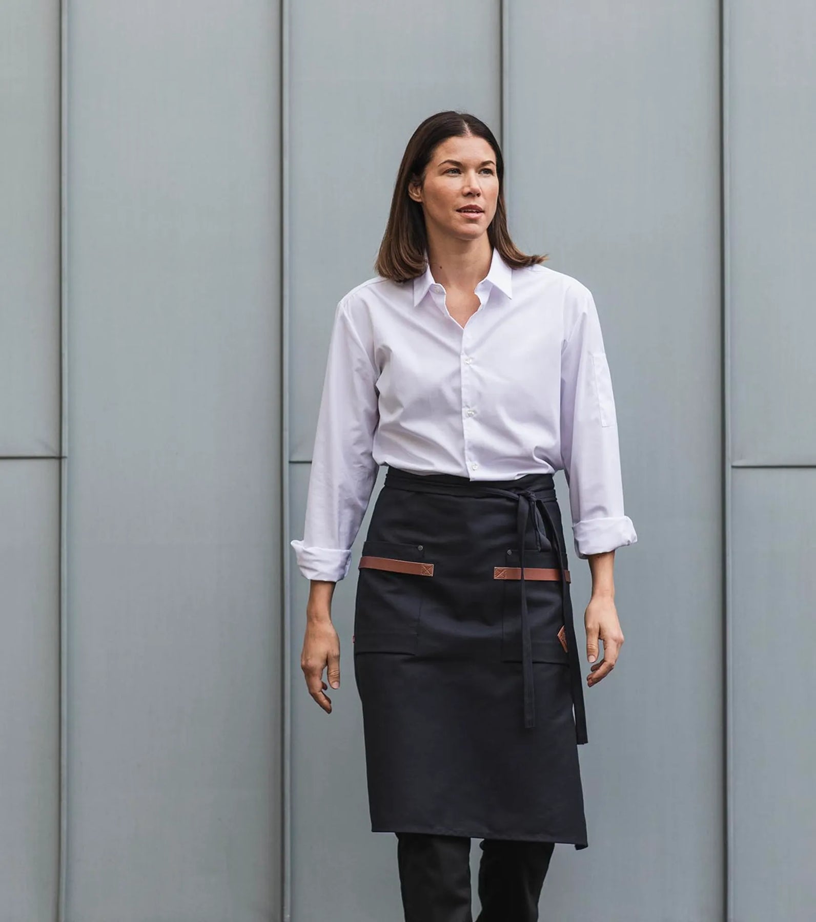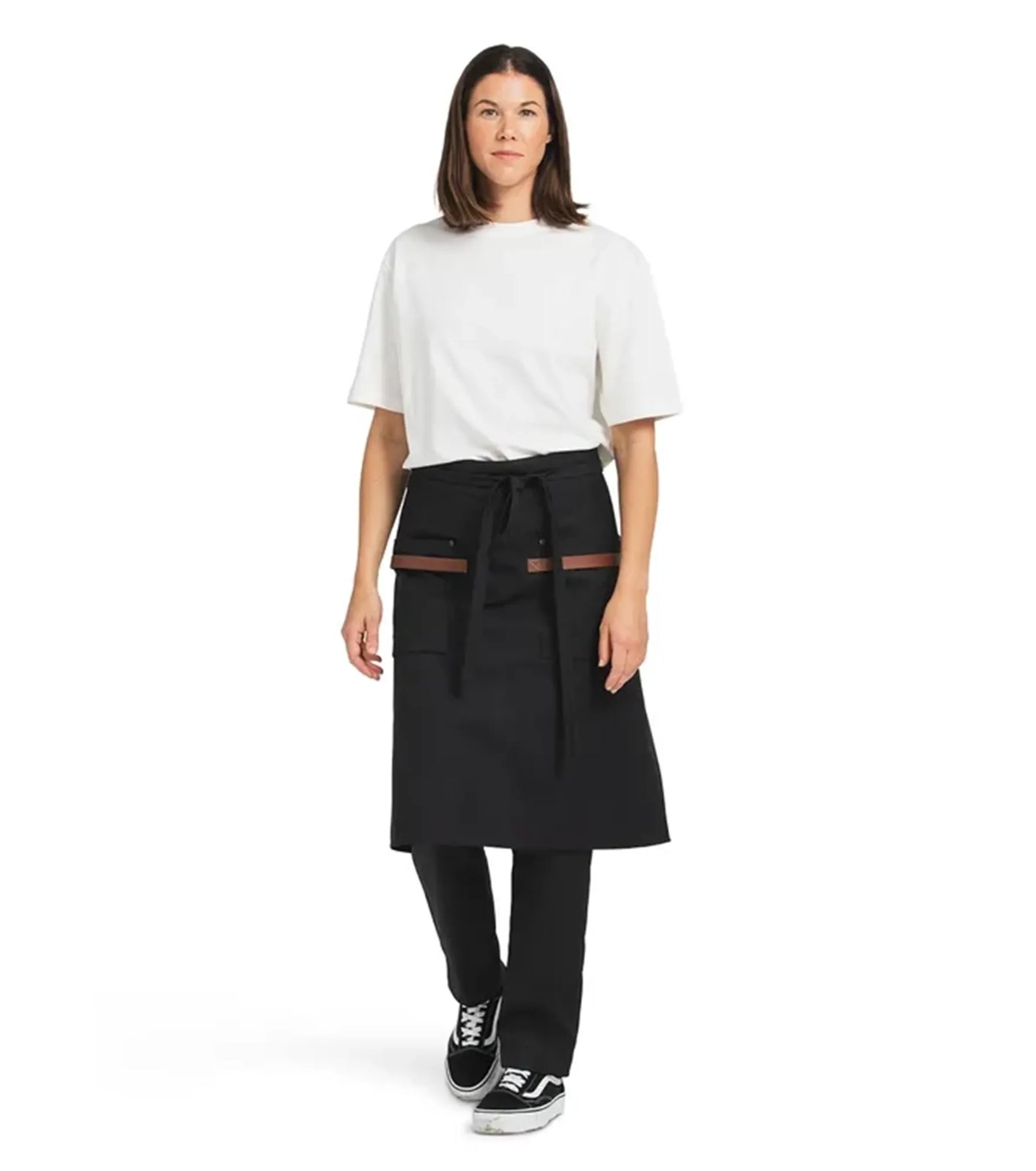 Stijlvol canvas schort met grote zakken en duurzame, afwasbare leren details.