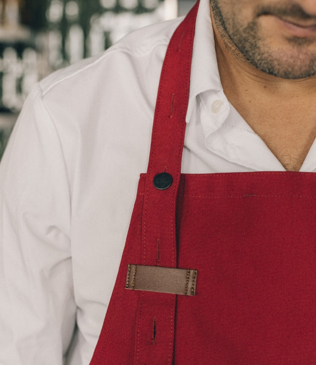 Match det røde forkleet med en komfortabel kokkejakke eller T-skjorte. Perfekt både på kjøkkenet og til servering under festlige anledninger.